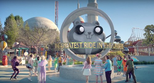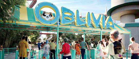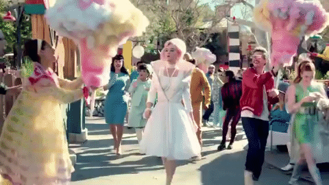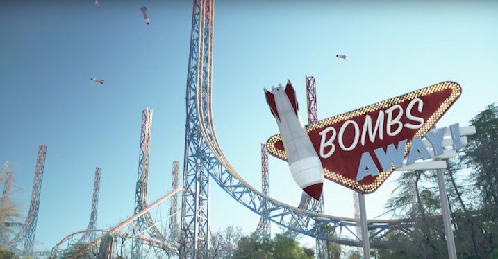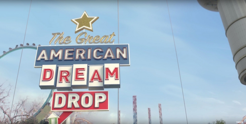Throughout the video, there is a constant irony of having a theme park modeled off the nation’s issues. For example, the ride labeled “The Great American Dream Drop” is a metaphor for the housing crisis. Heterosexual couples step into suburb-style mini houses, the houses then get pulled up in the air and dropped back down again. The housing crisis left many families in debt and the US in an unstable economic condition; nevertheless, the couples are seen giggling as they step into their house. This selective absurdity is shown to emphasize the idea that people are becoming numb to societal issues. The ride “Bombs Away” shows roller coaster cars shaped like nuclear bombs shooting straight up into the air. Earlier on in the video Perry gets offered a large mass of cotton candy shaped like a mushroom cloud. These images of bombs and nuclear clouds are usually seen in a negative light; in Oblivia however, nuclear warfare is trivialized and guests seem apathetic to the danger. This visual irony enhances the song’s message of societal unawareness, and the inherent threat that it creates.